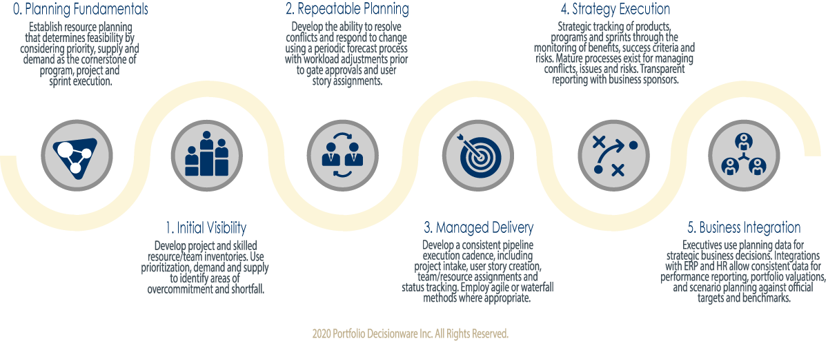 The path to resource planning success includes steps along the maturity model. With this approach, and regular assessments, your organization begins to understand your progression, to celebrate little wins, and to build momentum with your user community.